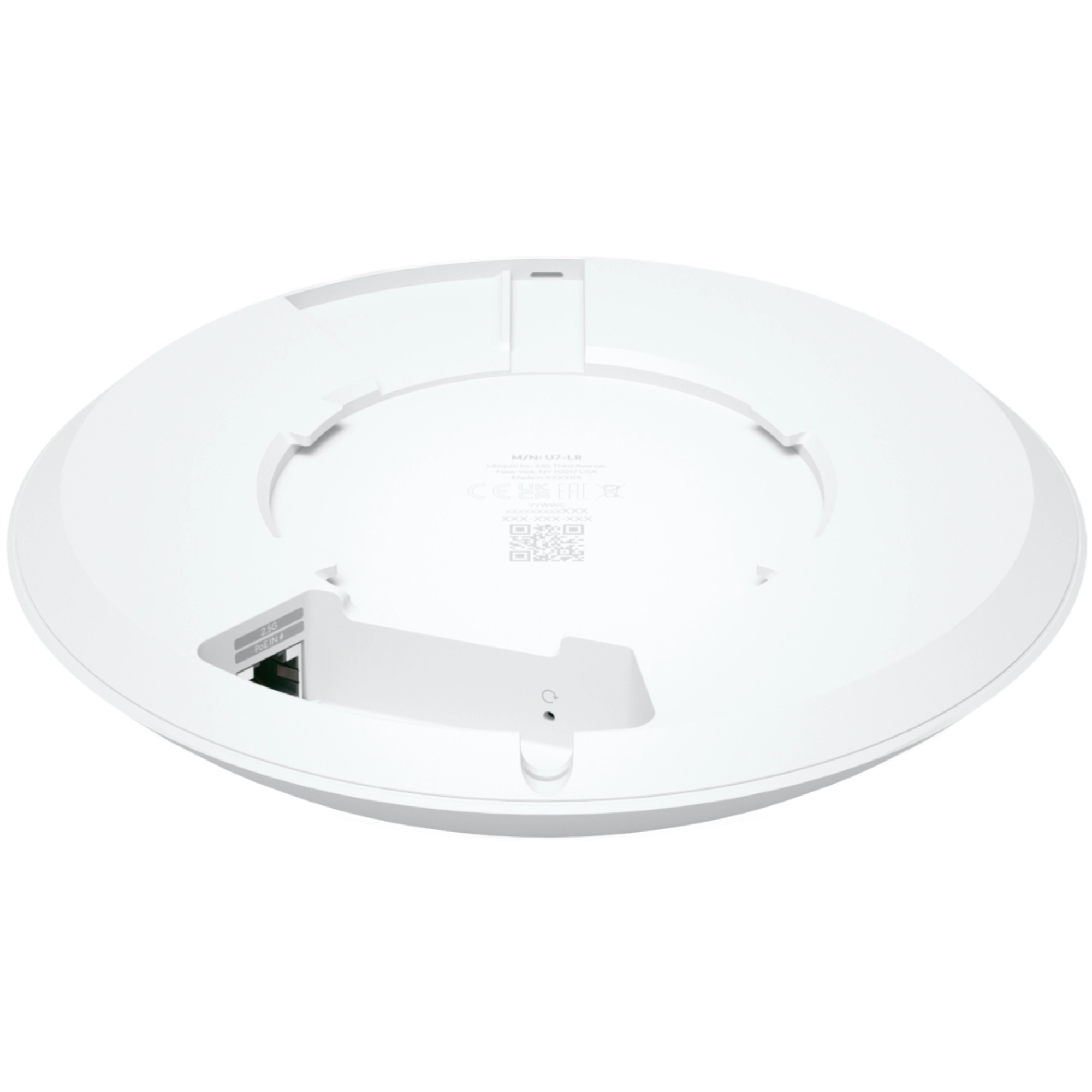 The Unifi U7 LR is a high-performance WiFi 7 access point with an uplink speed of 2.5 GbE. It features 5 spatial streams and supports over 300 clients. The device uses PoE for power, has a single 2.5 GbE RJ45 port, and can be mounted on a wall or ceiling.