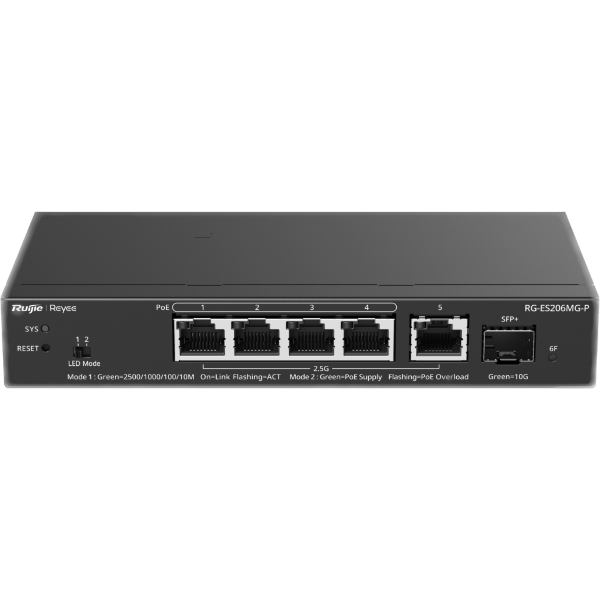 The Reyee RG-ES206MG-P is a cost-effective smart cloud-managed switch. It features five 2.5G ports and one 10GE SFP+ port. The switch also provides power to devices via four PoE Out ports, using the IEEE 802.3 af/at standards 70W PoE budget.